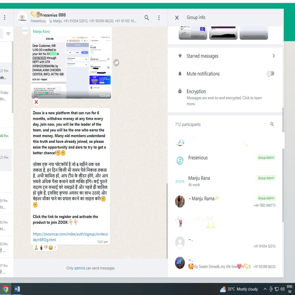 मथुरा: फ्रेशेनियस के बाद जूक्स इन कार डाॅट काॅम पोर्टल https://zooxincar.com/index/auth/signup/invitecode/nEROg.html तैयार कर और इन नंबरों 77619 89837, 94352 24956, 44 7882 840715 से व्हाट्सएप ग्रुप बनाकर लोगों को दूना पैसा करने का लालच देकर उनसे लाखों की ठगी की जा रही है। समय रहते केन्द्र व प्रदेश सरकार के आईटी सेल विभाग को ऐसे पोर्टलों पर कार्यवाही करने की आवश्यकता है।