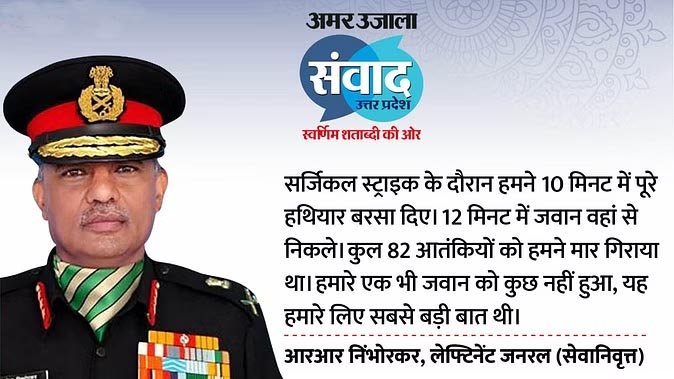 लखनऊ : साल 2016 में उड़ी के सैन्य शिविर पर आतंकी हमला हुआ। कुछ दिन बाद भारत ने अपने वीर जवानों की बदौलत पाकिस्तान को करारा जवाब दे दिया। पाकिस्तान के कब्जे वाले कश्मीर में हमारे जवान जमीन के रास्ते घुसे और कार्रवाई को अंजाम देकर बिना किसी खरोंच के लौट आए। सितंबर 2016 की यह सर्जिकल स्ट्राइक देश की सेना के साहस और शौर्य की कभी न भूलने वाली कहानी बन गए। इस सर्जिकल स्ट्राइक के नायक थे लेफ्टिनेंट जनरल (सेवानिवृत्त) राजेंद्र रामराव निंभोरकर जो ‘अमर उजाला संवाद उत्तर प्रदेश’ में मौजूद थे। उन्होंने ‘देश के सम्मान की बात’ विषय पर अपनी बात रखी।