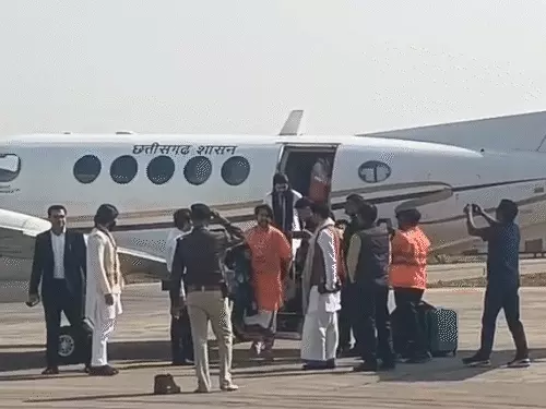 सरकारी विमान से कथा करने रायपुर पहुंचे धीरेंद्र शास्त्री:मंत्री खुशवंत भी साथ दिखे, कांग्रेस बोली- खजाने की डकैती