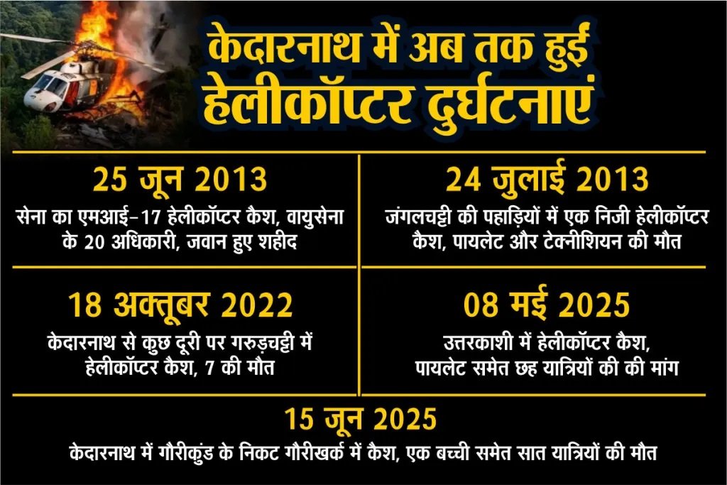 देहरादून : उत्तराखंड एक बार फिर हेलीकॉप्टर दुर्घटनाओं की मार झेल रहा है। 8 मई से 15 जून के बीच घटित इन हादसों ने न केवल श्रद्धालुओं में दहशत फैला दी है, बल्कि सिस्टम की कार्यशैली पर गंभीर सवाल भी खड़े कर दिए हैं।