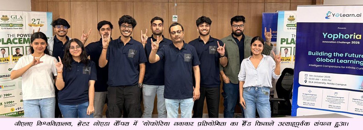 दैनिक उजाला, मथुरा : जीएलए विश्वविद्यालय, ग्रेटर नोएडा कैंपस में ‘योफोरिया नवाचार प्रतियोगिता 2025’ का ग्रैंड फिनाले उत्साहपूर्वक संपन्न हुआ। छह घंटे लंबे चुनौतीपूर्ण आयोजन को वेयर यू एलीवेट कंपनी ने यो लर्न एआई टीम के सहयोग और जीएलए विश्वविद्यालय की सहभागिता से सफलतापूर्वक आयोजित किया।