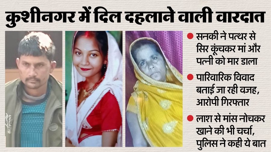 - यूपी के कुशीनगर में दिल दहलाने वाली वारदात सामने आई है, सनकी युवक ने पत्थर से सिर कूंचकर मां और पत्नी को मार डाला, इसके बाद लाश से मांस नोचकर खाने लगा