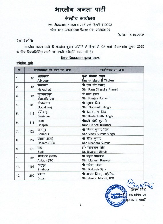 पटना : बीजेपी ने बुधवार को 12 नामों की दूसरी लिस्ट जारी कर दी है। लोक गायिका मैथिली ठाकुर को अलीनगर से टिकट दिया है। वहीं बक्सर से पूर्व IPS आनंद मिश्रा को उतारा गया है।