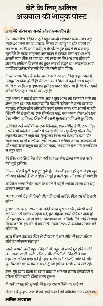 पढ़िए बेटे अग्निवेश के लिए अनिल अग्रवाल का पूरा पोस्ट