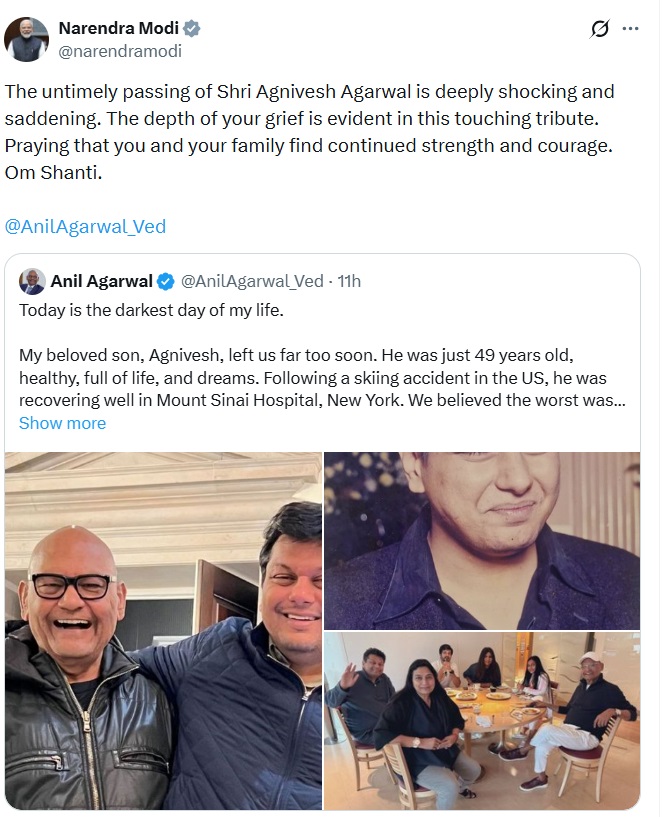 प्रधानमंत्री नरेंद्र मोदी ने अनिल अग्रवाल के पोस्ट रिप्लाई करते हुए X पर लिखा “अग्निवेश अग्रवाल का असामयिक निधन अत्यंत चौंकाने वाला और दुखदायी है। इस हृदयस्पर्शी श्रद्धांजलि में आपके गहन शोक की गहराई स्पष्ट झलक रही है। प्रार्थना है कि आप और आपका परिवार निरंतर शक्ति एवं साहस प्राप्त करें। ओम शांति।