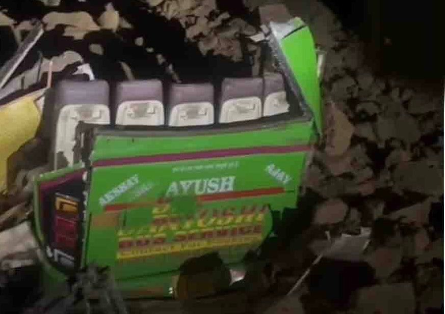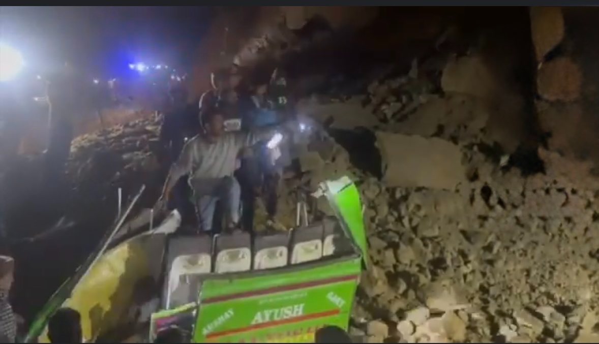 भलू के पास पूरा पहाड़ बस पर गिर गया। बस का केवल छत नजर आ रहा था। स्थानीय लोगों ने इसकी सूचना प्रशासन को दी।