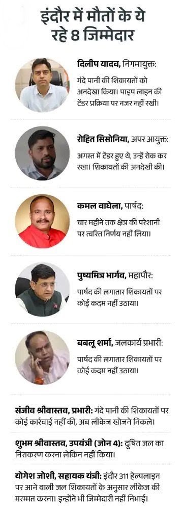 राहुल बोले- जहर बंटा और प्रशासन कुंभकर्णी नींद में रहा मामले में X पर लोकसभा में नेता प्रतिपक्ष राहुल गांधी ने कहा- इंदौर में पानी नहीं, जहर बंटा और प्रशासन कुंभकर्णी नींद में रहा। घर-घर मातम है, गरीब बेबस हैं और ऊपर से BJP नेताओं के अहंकारी बयान। जिनके घरों में चूल्हा बुझा है, उन्हें सांत्वना चाहिए थी, सरकार ने घमंड परोस दिया।