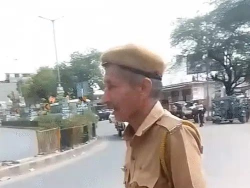 कॉन्स्टेबल ने कार सवार युवक के कंधे पर हाथ रखा, युवक के दूर हटने पर कॉन्स्टेबल ने हाथ जोड़ लिए।