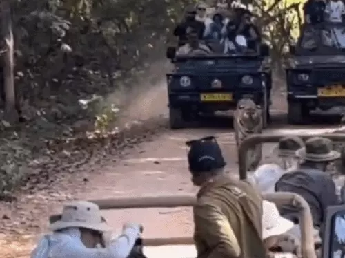 सवाई माधोपुर : रणथंभौर टाइगर रिजर्व में सफारी के दौरान बाघ का रास्ता रोकने का मामला सामने आया है। जोन-3 में पर्यटकों को लेकर निकली गाड़ियां टाइगर के दोनों तरफ खड़ी हो गईं, जिससे टाइगर को निकलने का रास्ता नहीं मिला।