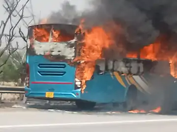 मथुरा में यमुना एक्सप्रेसवे पर चलती बस में लगी आग:48 यात्रियों को सुरक्षित निकाला गया, बड़ा हादसा टला