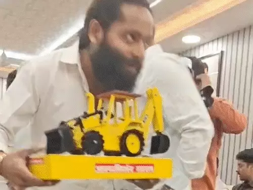 पंकज चौधरी से मुलाकात करने एक कार्यकर्ता बुलडोजर की रेप्लिका लेकर पहुंचा।