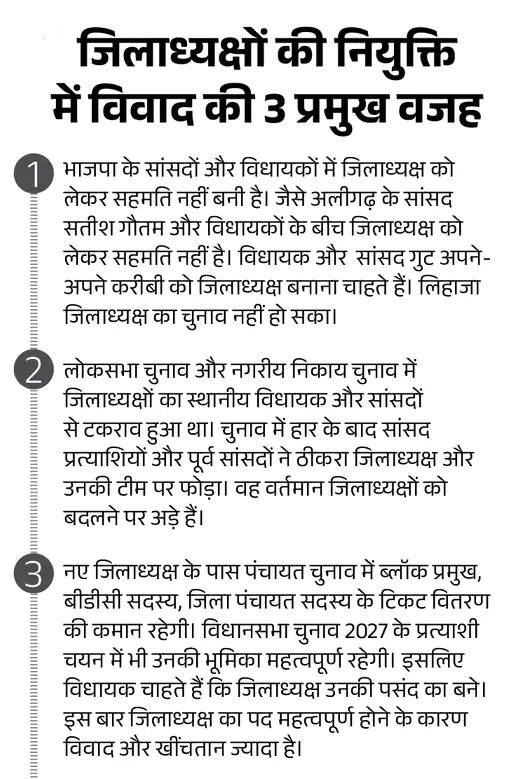 भाजपा प्रदेश अध्यक्ष भूपेंद्र सिंह चौधरी का कहना है कि सीएम योगी, दोनों डिप्टी सीएम के महाकुंभ और दिल्ली चुनाव में व्यस्त होने के कारण कोर कमेटी की बैठक नहीं हो सकी। आगामी दिनों में कोर कमेटी की बैठक के बाद जिलाध्यक्षों की सूची फाइनल की जाएगी।