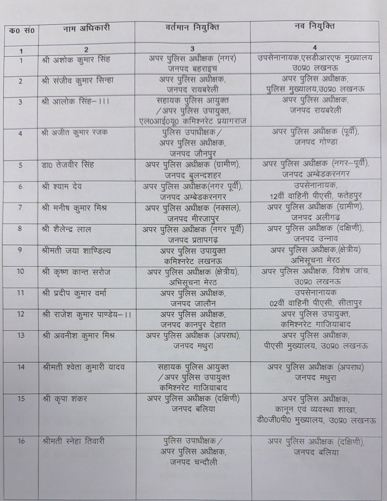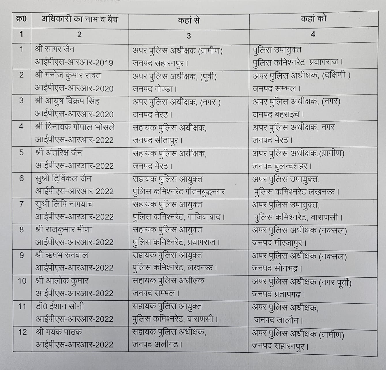 आईपीएस-आरआर-2019 बैच के सागर जैन को अपर पुलिस अधीक्षक (ग्रामीण) सहारनपुर से पुलिस उपायुक्त, पुलिस कमिश्नरेट प्रयागराज बनाया गया है। आईपीएस-आरआर-2020 बैच के मनोज कुमार रावत को अपर पुलिस अधीक्षक (पूर्वी) गोंडा से अपर पुलिस अधीक्षक (दक्षिणी) सम्भल भेजा गया है, जबकि आयुष विक्रम सिंह को अपर पुलिस अधीक्षक (नगर) मेरठ से अपर पुलिस अधीक्षक (नगर) बहराइच तैनात किया गया है।