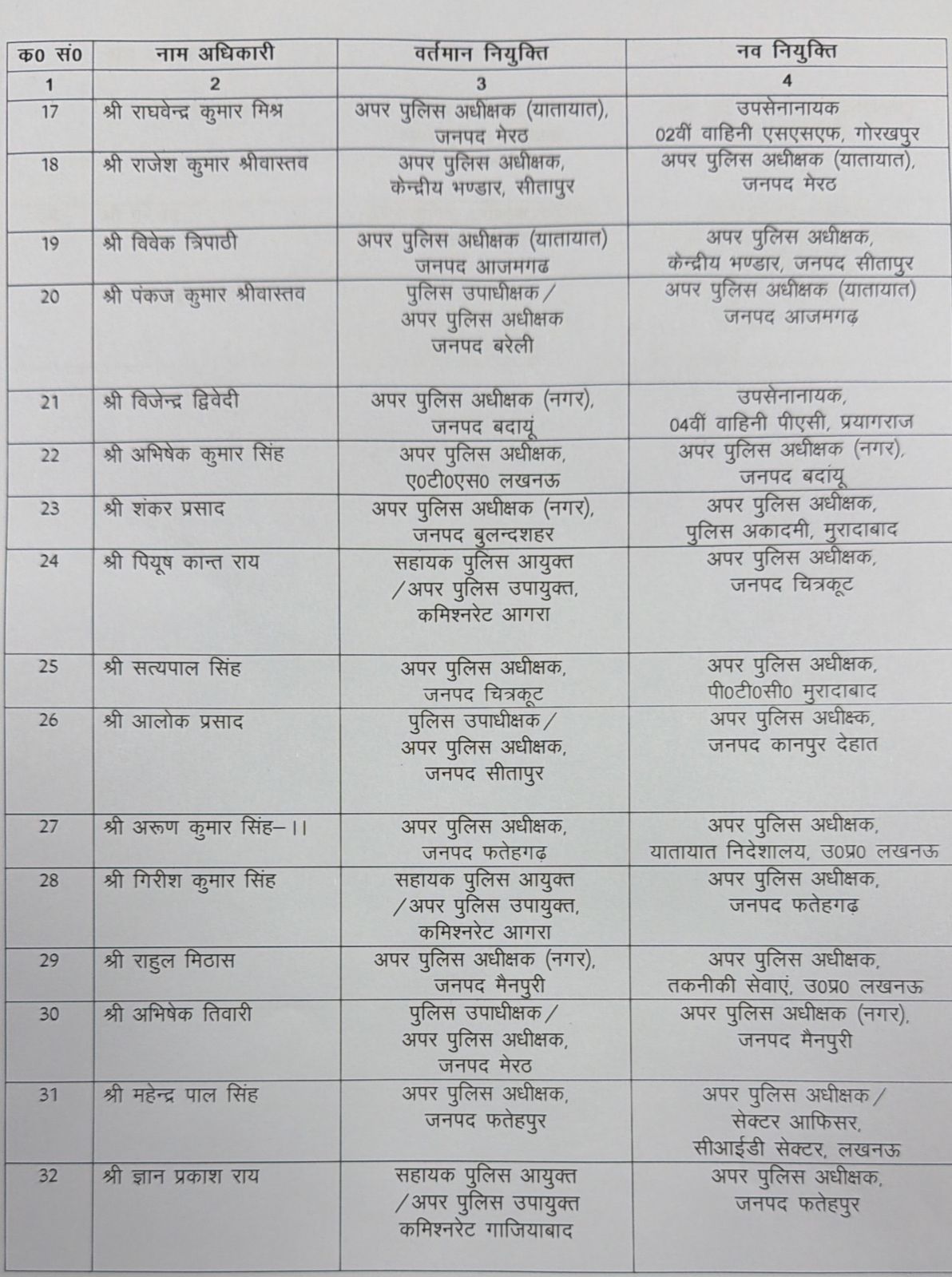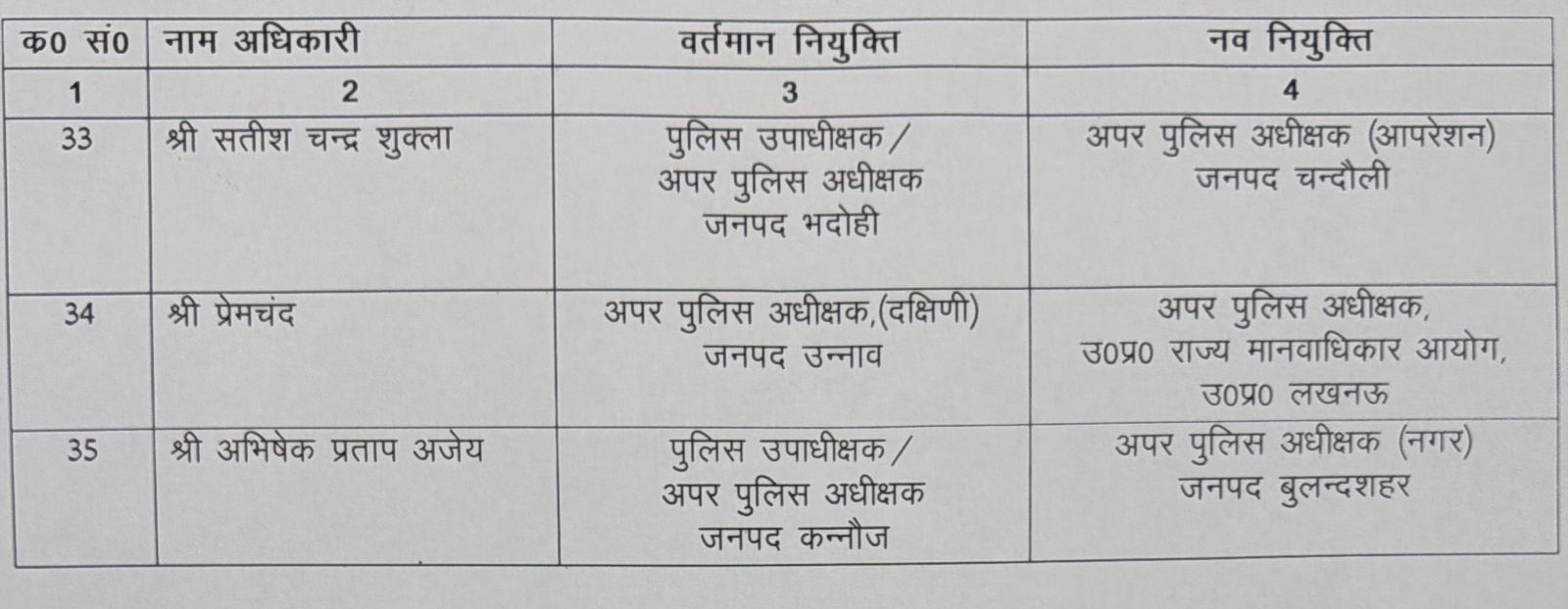 आईपीएस-आरआर-2022 बैच के विनायक गोपाल भोसले को सहायक पुलिस अधीक्षक सीतापुर से अपर पुलिस अधीक्षक (नगर) मेरठ, अंतरिक्ष जैन को सहायक पुलिस अधीक्षक मेरठ से अपर पुलिस अधीक्षक (ग्रामीण) बुलन्दशहर, ट्विंकल जैन को सहायक पुलिस आयुक्त गौतमबुद्धनगर से अपर पुलिस उपायुक्त लखनऊ तथा लिपि नागायच को सहायक पुलिस आयुक्त गाजियाबाद से अपर पुलिस उपायुक्त वाराणसी बनाया गया है।