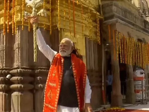 वाराणसी : काशी में प्रधानमंत्री नरेंद्र मोदी ने बुधवार को बाबा विश्वनाथ के दर्शन किए। उन्होंने गर्भगृह में 20 मिनट तक पूजा-अर्चना की। पांच पंडितों ने उन्हें पूजा कराई, माला पहनाई और त्रिपुंड लगाया। पीएम मंदिर से बाहर निकले तो भाजपा नेताओं ने उन्हें त्रिशूल और डमरू भेंट किया। इसके बाद प्रधानमंत्री ने त्रिशूल उठाकर लहराया।