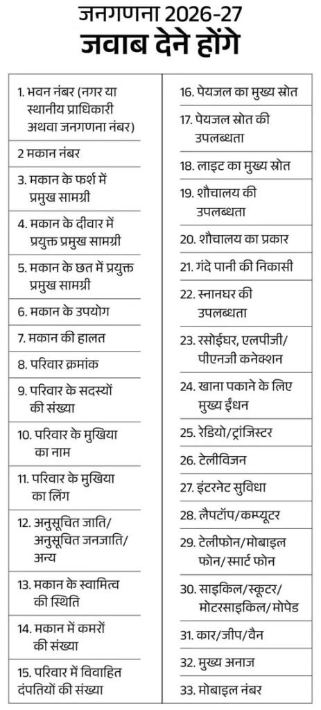 जनगणना में मुख्य रूप से आपके मकान की स्थिति (कच्चा या पक्का), घर में बिजली, पानी, शौचालय, वाहन, टीवी, इंटरनेट से जुड़े करीब 33 सवाल पूछे जाएंगे। जनगणनाकर्मी आपसे ये 3 सवाल नहीं पूछ सकते-