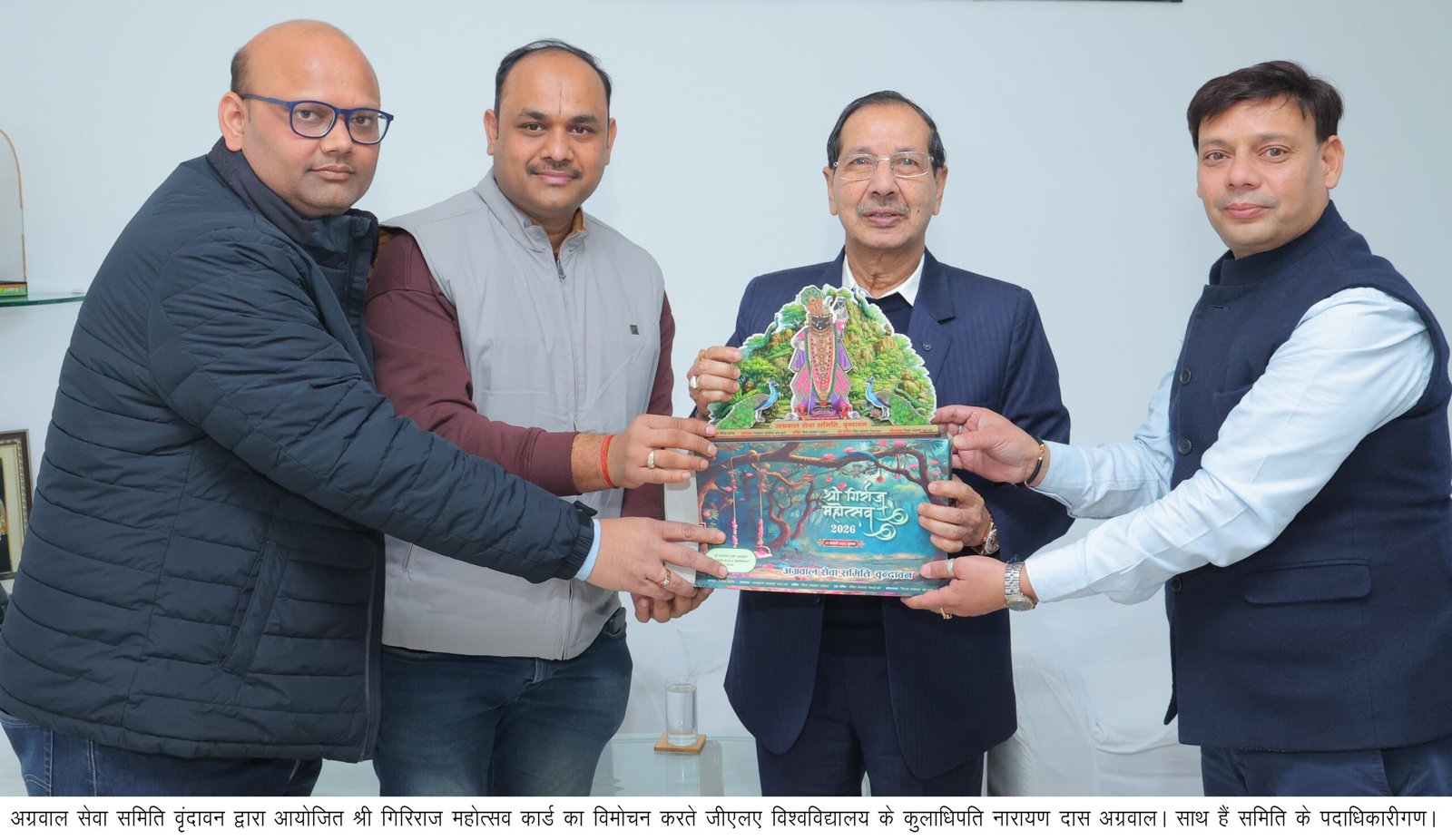 कुलाधिपति ने कहा कि अग्रवाल सेवा समिति द्वारा निरंतर किए जा रहे धार्मिक व सामाजिक कार्य सराहनीय हैं। गिरिराज महाराज की कृपा से ऐसे आयोजन समाज में सद्भाव, सहयोग और सेवा भावना को मजबूत करते हैं। यह आयोजन हर वर्ष श्रद्धा और सेवा भाव के साथ किया जाता है। उन्होंने कार्ड की सुंदर प्रस्तुति की सराहना करते हुए इसे गिरिराज महोत्सव के प्रचार-प्रसार का सशक्त माध्यम बताया।