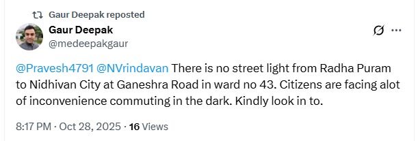 स्थानीय निवासी दीपक गौर ने बताया कि उन्होंने कई बार नगर निगम को ट्विटर पर टैग कर यह समस्या उठाई, लेकिन अब तक कोई कार्रवाई नहीं की गई। उन्होंने कहा, “जब अधिकारी इलाके का निरीक्षण ही नहीं करते, तो उन्हें समस्या दिखेगी कैसे? अंधेरे में रह रहे लोग परेशान हैं, लेकिन नगर निगम के अधिकारी अपने कार्यालयों तक सीमित हैं।”