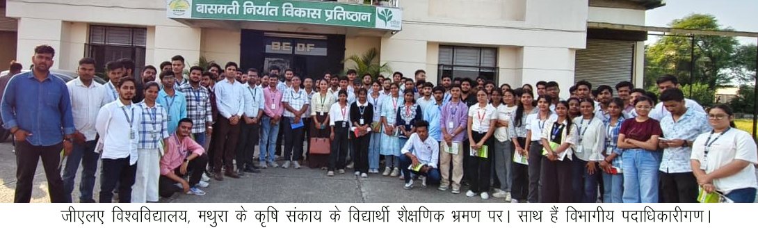 दैनिक उजाला, मथुरा : किसानों के जीवन पर पड़ने वाले प्रभावों से लेकर खेती के हर पहलू को समझने के उद्देश्य से जीएलए विश्वविद्यालय, मथुरा के कृषि विज्ञान संकाय द्वारा बीएससी (ऑनर्स) कृषि एवं एमएससी (कृषि) के विद्यार्थियों के लिए एक दिवसीय शैक्षणिक भ्रमण का सफल आयोजन किया गया। यह भ्रमण भारतीय कृषि अनुसंधान परिषद, नई दिल्ली के दिशा-निर्देशों के अंतर्गत विद्यार्थियों को व्यवहारिक ज्ञान एवं अनुभवात्मक अधिगम प्रदान करने के उद्देश्य से आयोजित किया गया।