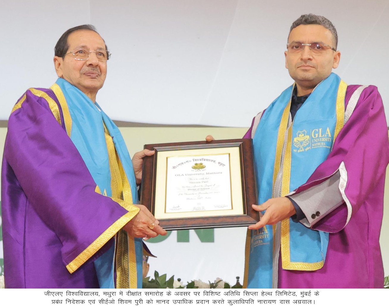 दैनिक उजाला, मथुरा : जीएलए विश्वविद्यालय के 14वें दीक्षांत समारोह के विशिष्ट अतिथि सिप्ला हेल्थ लिमिटेड, मुंबई के प्रबंध निदेशक एवं सीईओ शिवम पुरी ने जीएलए विश्वविद्यालय के दीक्षांत समारोह में छात्रों को संबोधित करते हुए कहा कि आज का युवा भारत इतिहास के सबसे सुनहरे दौर में प्रवेश कर रहा है। अपने पांच मिनट के प्रेरक उद्बोधन में उन्होंने बताया कि छात्र जीवन में आने वाला डर, असमंजस और भविष्य को लेकर अनिश्चितता स्वाभाविक है, पर भारत जैसी तेज़ी से उभरती अर्थव्यवस्था में प्रवेश करना स्वयं में सबसे बड़ा अवसर है।
