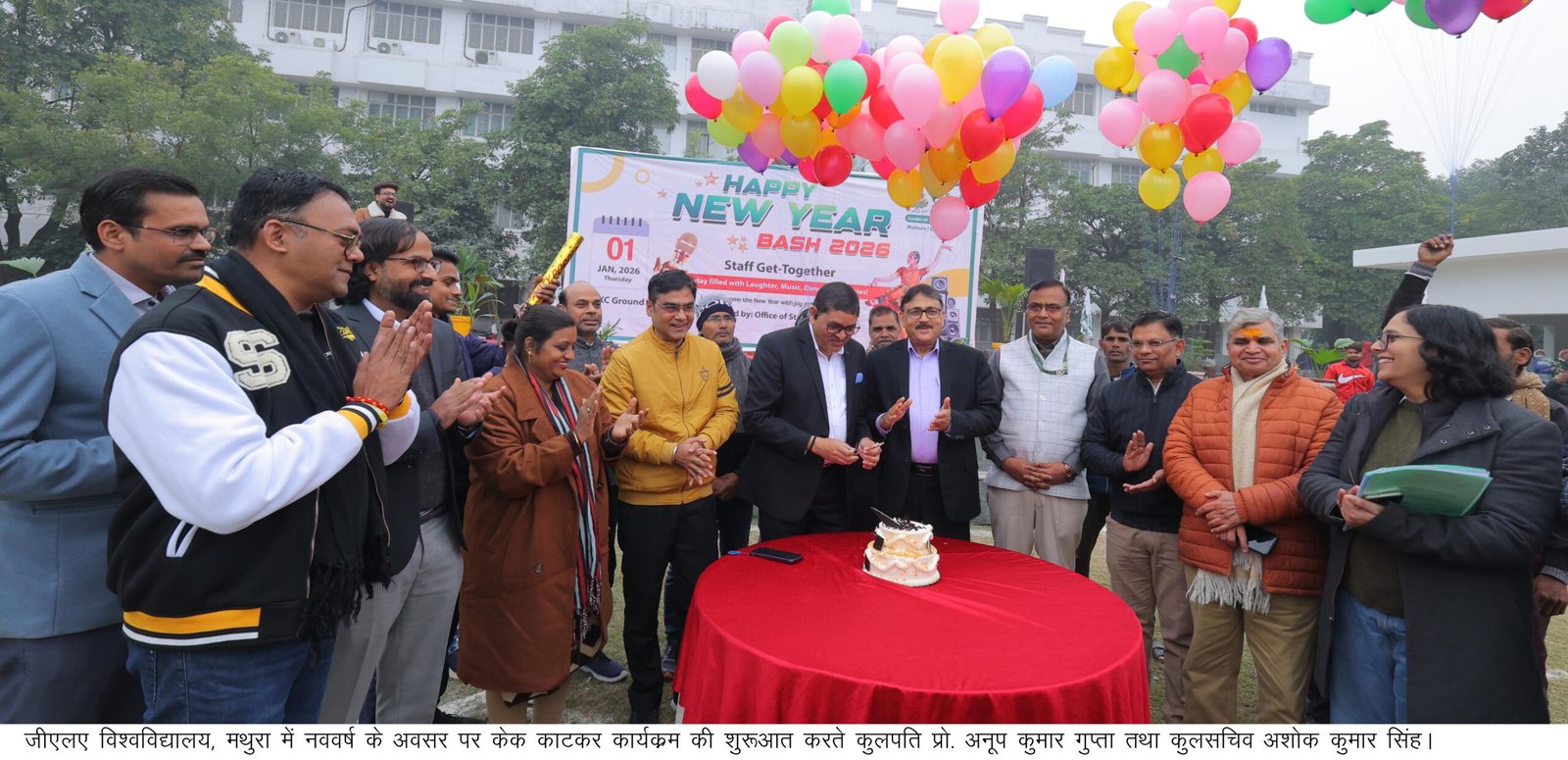 मथुरा: जीएलए विश्वविद्यालय परिसर में नववर्ष 2026 के आगमन को हर्षोल्लास, उल्लास और सांस्कृतिक रंगों के साथ धूमधाम से मनाया गया। इस विशेष अवसर पर विश्वविद्यालय के कुलपति प्रो. अनूप कुमार गुप्ता, कुलसचिव अशोक कुमार सिंह सहित समस्त स्टाफ ने सहभागिता की। कार्यक्रम की शुरुआत केक कटिंग के साथ हुई, जिसके बाद पूरे परिसर में उत्सव का माहौल बन गया।