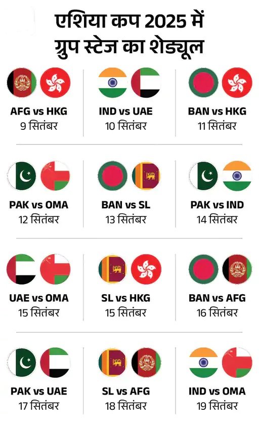 ग्रुप में सभी टीमें एक-दूसरे के खिलाफ 1-1 मैच खेलेंगी। भारत 10 सितंबर को UAE, 14 को पाकिस्तान और 19 को ओमान से भिड़ेगा।