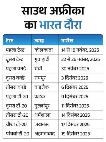भारत और साउथ अफ्रीका के बीच पहला टेस्ट 14 नवंबर से कोलकाता में, जबकि दूसरा 22 नवंबर से गुवाहाटी में खेला जाएगा। यह पहला मौका होगा जब गुवाहाटी में कोई टेस्ट मैच खेला जाएगा।