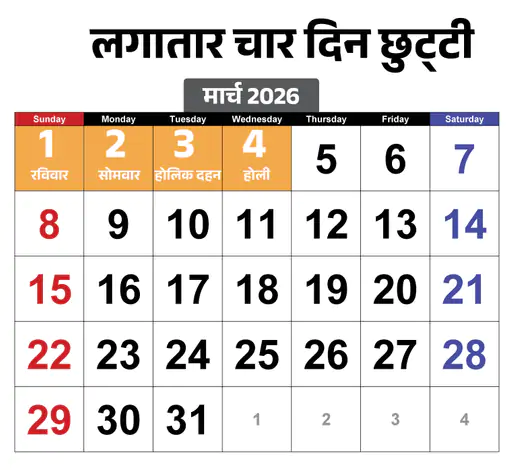 सरकार ने 2 , 3 और 4 मार्च यानी सोमवार, मंगलवार और बुधवार की छुट्टी का ऐलान किया है। जबकि 1 मार्च को रविवार है। यानी रविवार से बुधवार तक एक साथ 4 दिन की छुट्टी मिलेगी।