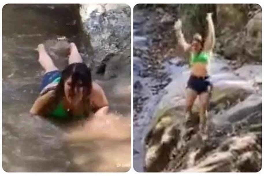 सामने आए वीडियो में देखा जा सकता है कि कैसे एक महिला झरने में जाकर मजे ले रही है। उसे वीडियो बनवाने का शौक चढ़ा हुआ था। वीडियो के चक्कर में महिला बिना कुछ सोचे झरने के समीप जाकर झूमने लग जाती है। महिला नीचे खड़े पानी में पहले कूदने का विचार मन में लाती है। 10 सेकेंड के इस वीडियो में पहले यही नजर आता है कि महिला की मंशा पानी में छलांग लगाने की है, लेकिन जैसी ही वह छलांग लगाने के लिए आगे बढ़ती है तो उसके पैर डगमगा जाते हैं।